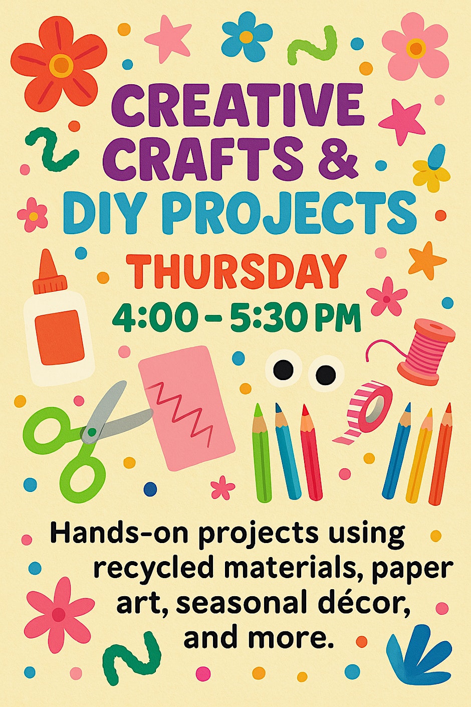 Join us for a weekly session full of creativity and crafty fun! In this hands-on class, kids will work on a variety of projects using recycled materials, paper art, natural textures, and more.