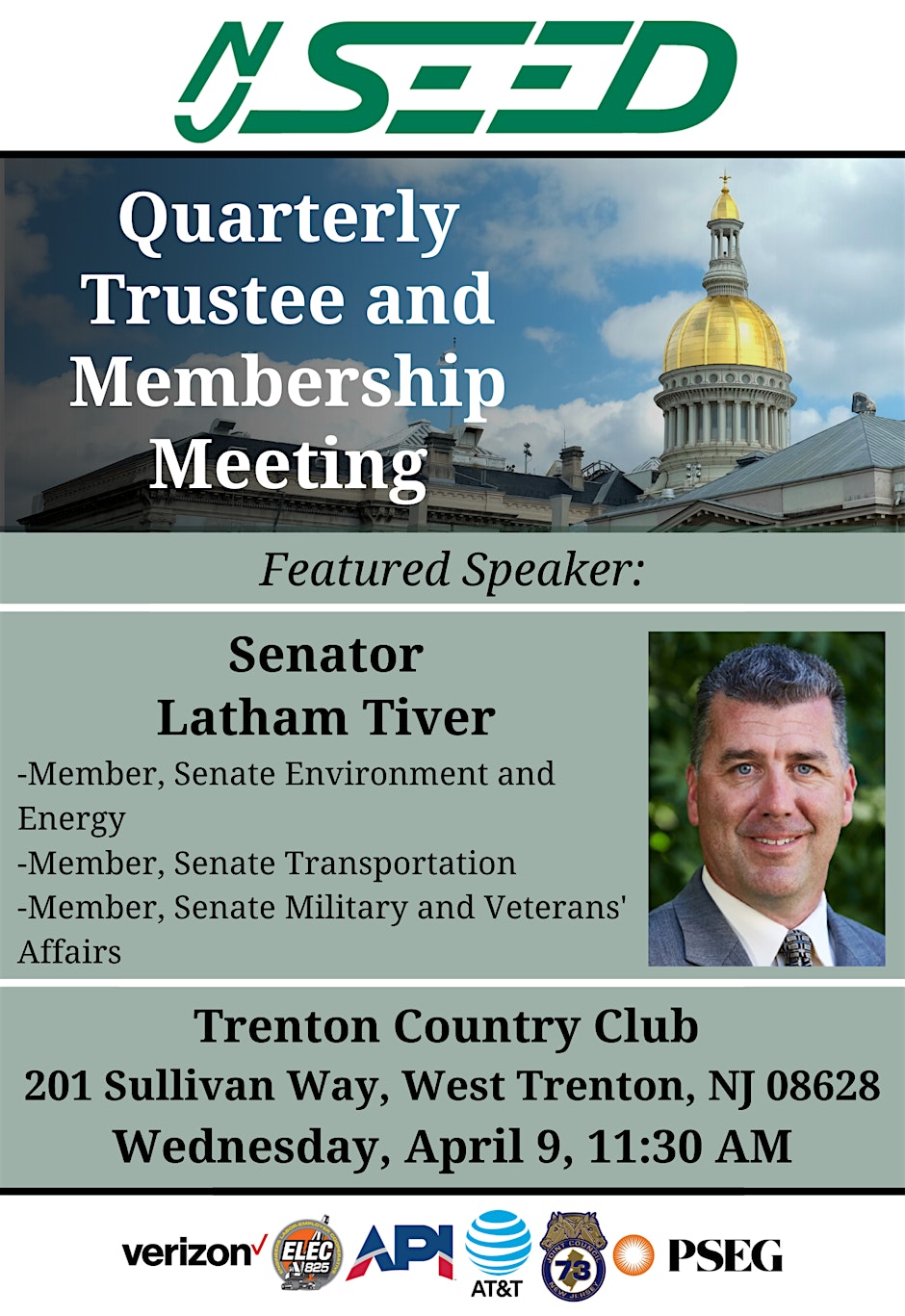 NJ SEED is proud to announce that Senator Latham Tiver will be joining us at our next Trustee and Membership meeting